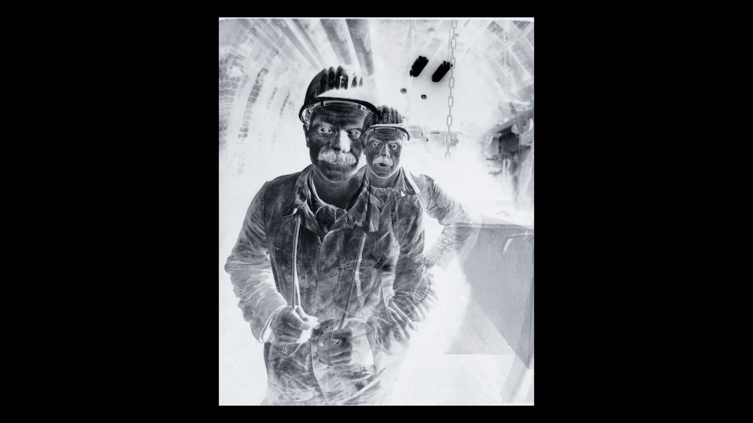 Die Werkreihe LOST?. befragt Arbeit und Fortschritt. Historische Bergwerksbilder erscheinen als Negative und untersuchen den Bedeutungsverlust im Nachleben industrieller Transformation.